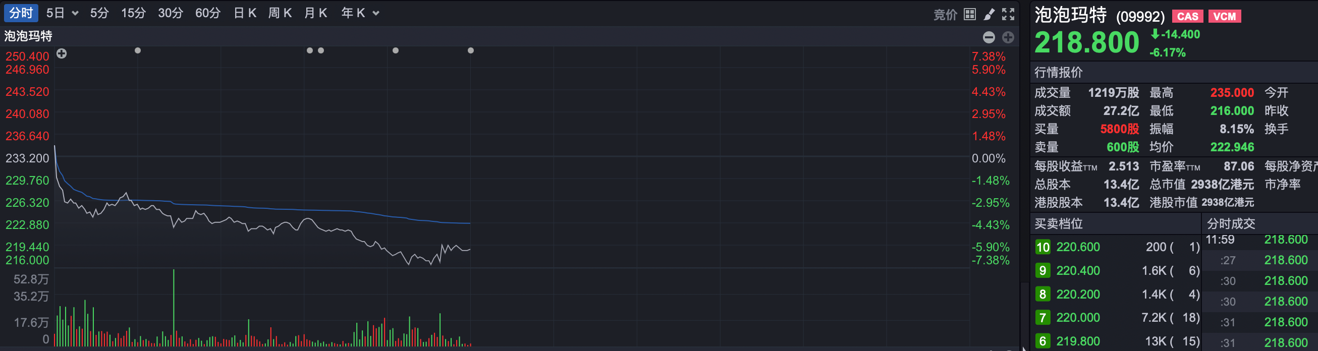 然而,刚刚创下历史新高,今日开盘之后,泡泡玛特突然大跌,盘中最大跌幅一度超过7%,成交额也急剧放大。仅在上午交易时段,其成交额就达27.2亿港元,几乎接近昨日全天28.4亿港元的成交额。