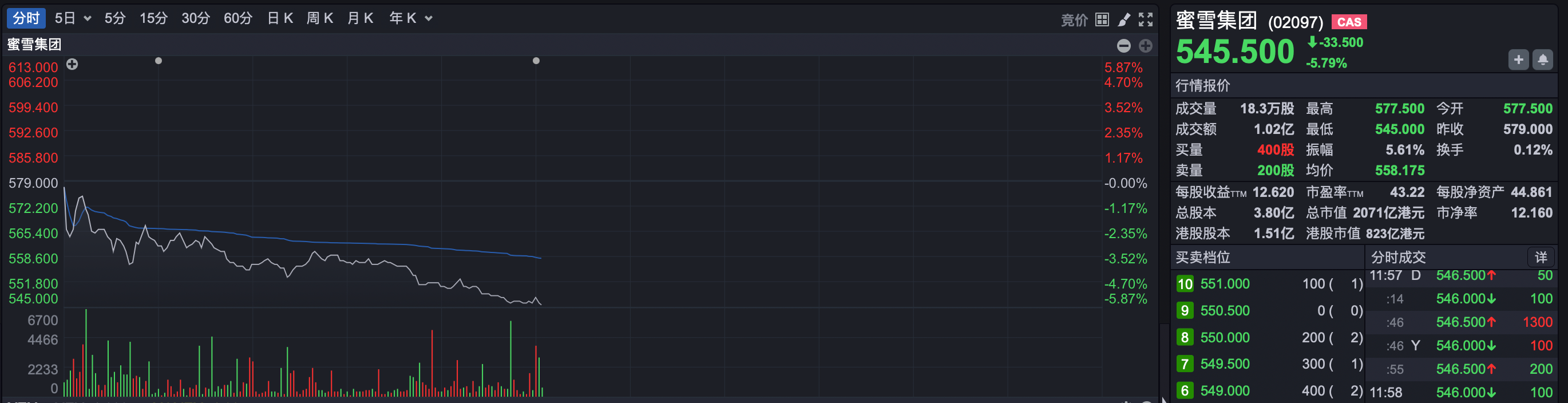 今年3月初,蜜雪集团在港交所上市,立刻成为最热门标的之一。蜜雪集团招股价202.5港元/股,上市首日最低价256港元/股。而昨日,蜜雪集团最高价已达到579港元,较招股价大涨186.6%,总市值也突破了2000亿港元。